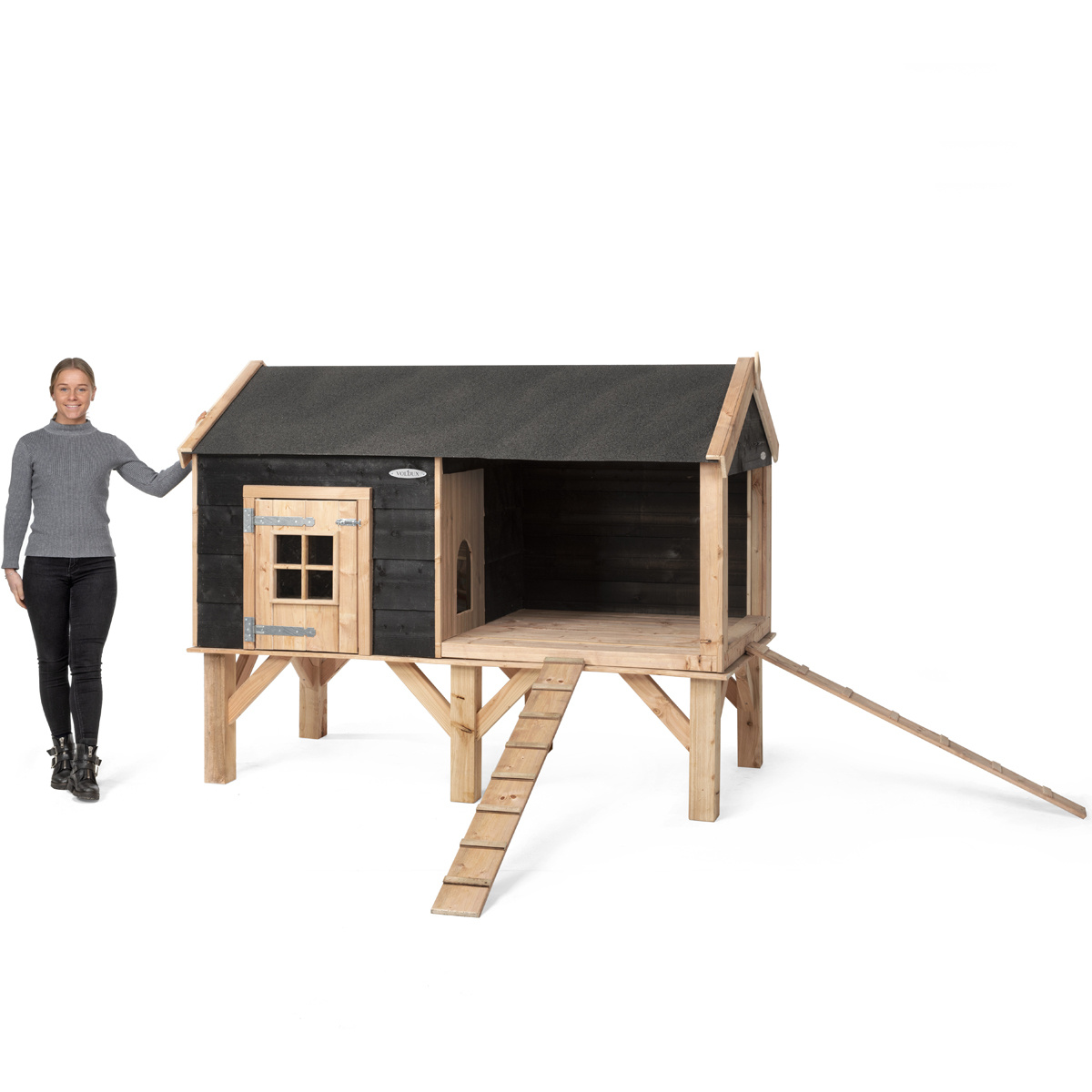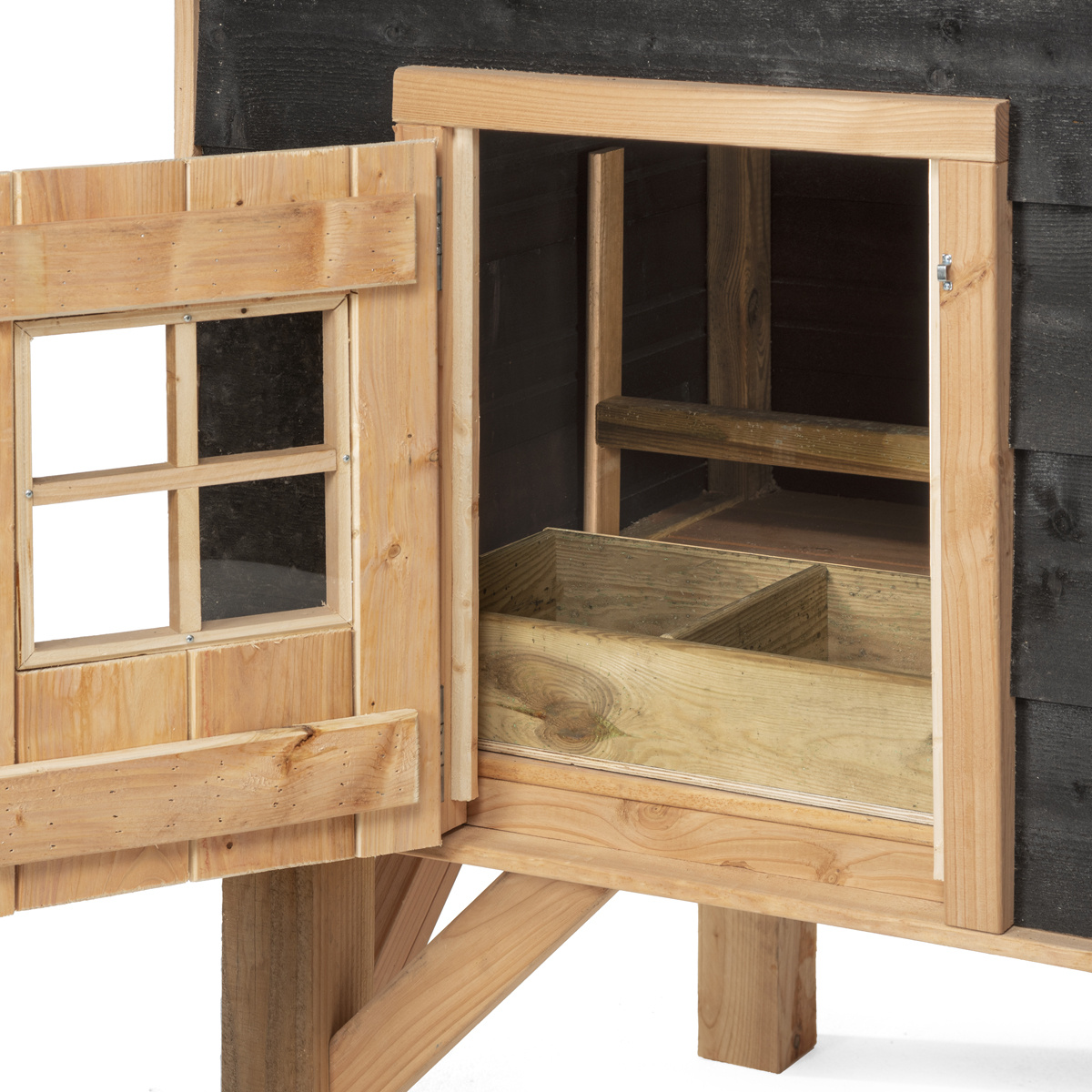 Het kippenhok is opgebouwd uit een verhoogd Douglas houten frame, deze houtsoort is perfect voor buitengebruik én vraagt geen onderhoud. Dit geldt ook voor de zwarte potdeksel afwerking van het kippenhok. De combinatie van deze materialen geeft een mooie uitstraling aan het zwarte nachthok voor kippen.