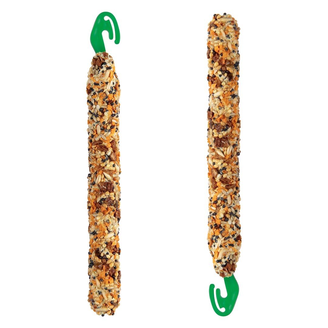 Sticks voor vinken met o.a. wortel en appel; 2 stuks 60 gram; Een lekkernij voor vinken en tropische vogels met verschillende soorten zaden op een natuurlijk houten stokje. De sticks zijn meerdere keren afgebakken, waardoor de zaden stevig op het houten stokje zitten.